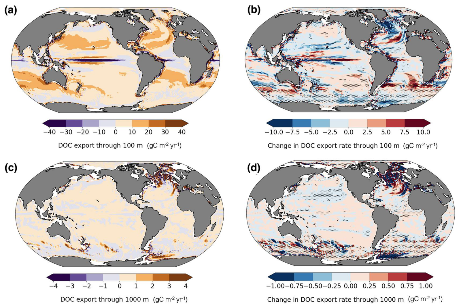 Fig. 1: DOC export rates at 100 and 1000 m and projected changes. Present-day (a, c); future minus present (b, d). Negative values indicate upward transport. Dots mark regions with significant changes (α=0.05) (Flanjak et al., 2025).