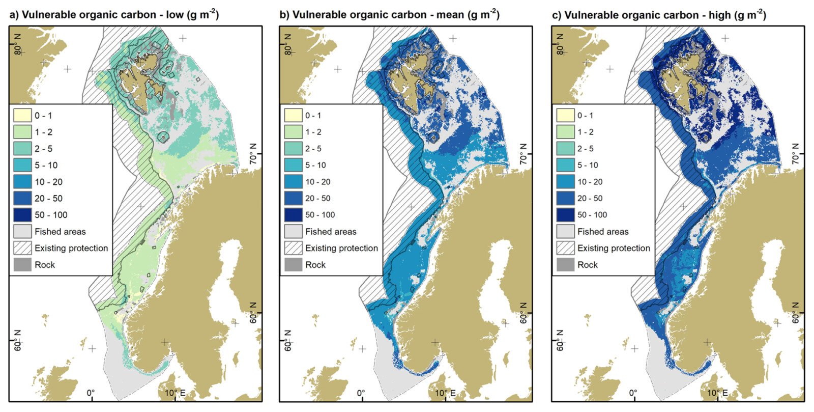 Fig. 2: Vulnerable organic carbon stocks of the surface layer for the three fishing impact scenarios: (a) low, (b) mean and (c) high. Existing area-based protection measures Area-based protection measures based on the regulation on the protection of coral reefs, Paragraph 58 of the harvest regulations, and the regulation on vulnerable marine ecosystems (VMEs). Rock refers to hard substrates, mainly rock and boulders. Source of land areas: ESRI (Diesing et al., 2025).