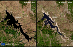 Image courtesy of Copernicus. These images of Lake Alto del Flumendosa, which supplies fresh water to a large part of eastern Sardinia were acquired by one of the Copernicus Sentinel-2 satellites on 23/01/2022 and 28/01/2024 and show the significant decrease in the water level of the reservoir.