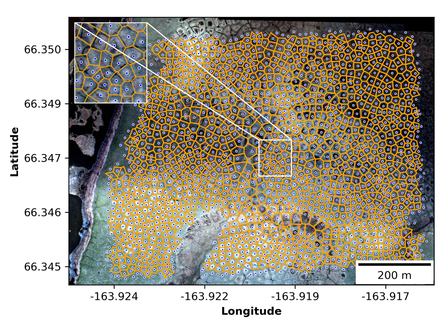 Fig 2: This figure from the study shows an aerial view of Cape Blossom overlaid with Voronoi diagrams derived from clustered volunteer-contributed ice-wedge polygon center points