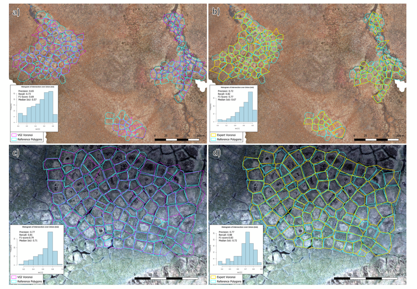 Then, researchers used the crowd-sourced centroid data to reconstruct the ice-wedge polygon networks with Voronoi diagrams, enabling the extraction of important geomorphological (e.g., polygon area, perimeter) and hydrological (e.g., network topology, betweenness centrality) parameters. Knowing these parameters is valuable for researchers as they can be used to gather insights into past and current changes in the permafrost landscape.