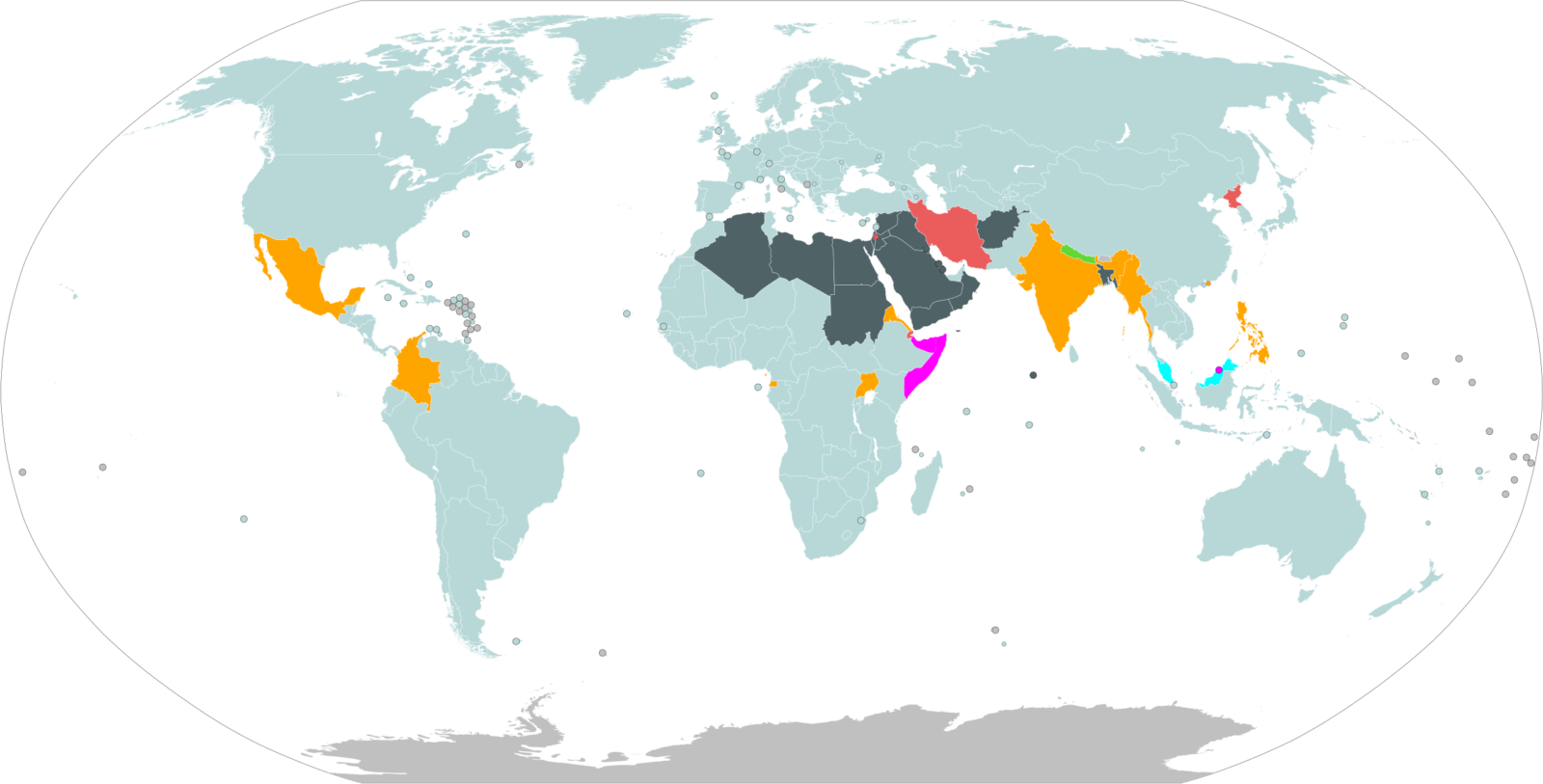 Map showing the days of the week that people work. Color codes: Monday-Friday (gray-blue), Monday-Saturday (orange), Sunday-Thursday (dark gray), Saturday-Thursday (red), Sunday-Friday (green), Monday-Thursday & Saturday (purple), Mixed (cyan). Picture from Wikimedia (https://commons.wikimedia.org/wiki/File:Workweeks-map.svg)
