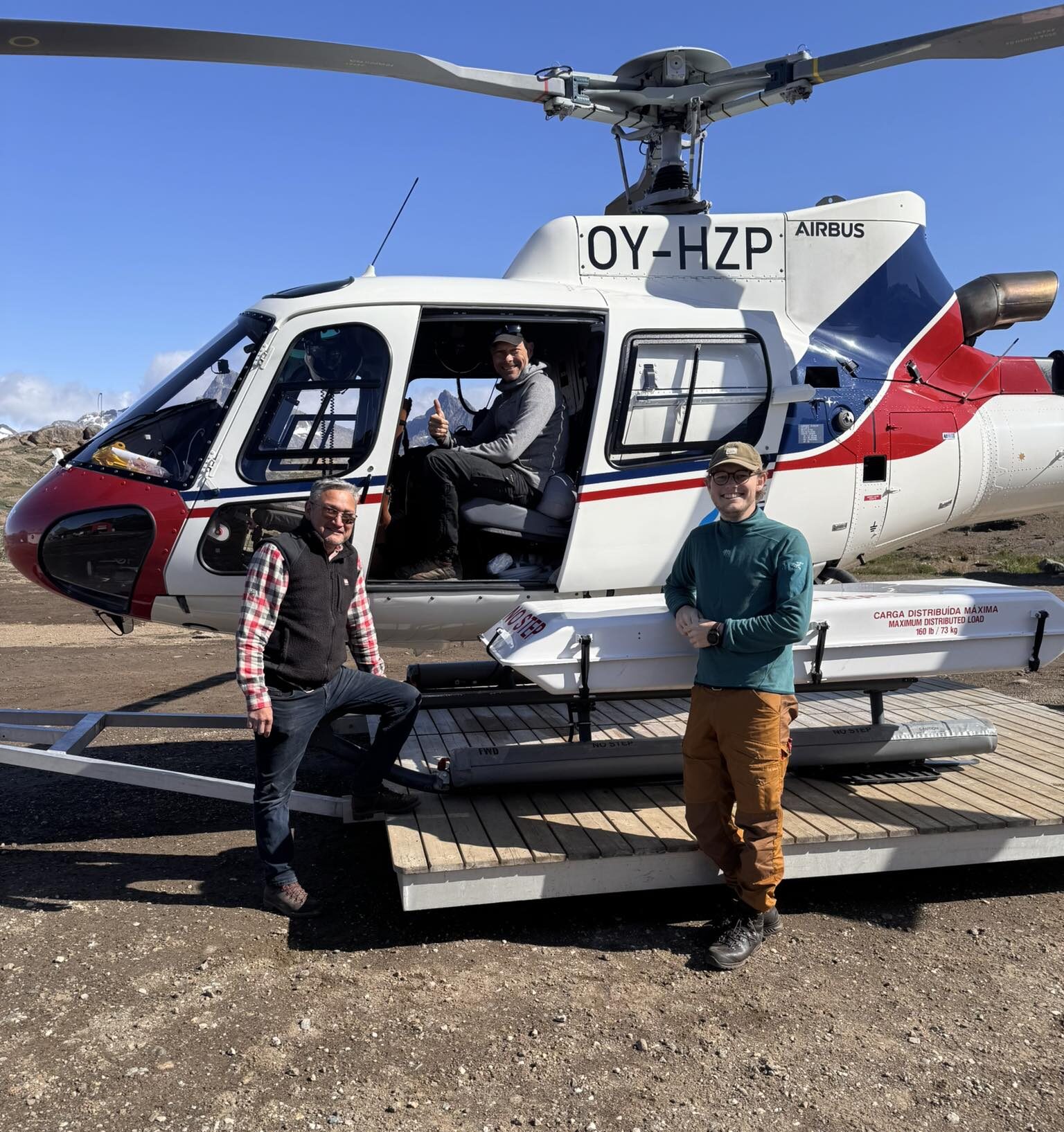 The GNET operational team before taking off (day 1). From left: Tim Nicholaisen – GreenlandCopter, Thomas H. Nylen and Christian Solgaard – both DTU Space. Picture cortesy by Jean-Marie Bärtsch.