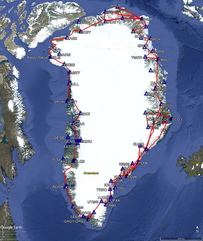 In 2025, the goal of the trip was not only to perform general maintenance and make various updates on all 49 remote GNET sites, but also to install two new GNET and a GNSS-IR specific site in Daneborg. The helicopter trip usually starts in Tasiilaq in Southeast Greenland – with preparation and packing of personal luggage, tools and extra hardware into the helicopter. To be sure that we got everything packed and ready to go, we go for a small roundtrip out from Tasiilaq, to visit our two GNET sites in Isortoq and at Helheim glacier. With the confirmation that we were ready to go, we headed north with the aim of circumnavigating Greenland counterclockwise. A planned roundtrip of roughly 12,000 km of rural remoteness and five weeks in each other’s compagnies.
