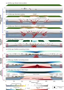 The Wilson Cycle describes the rhythm of tectonic activity on Earth. This includes ocean closure, mountain building, rifting and the formation of mature oceans. According to this theory, mountain ranges are formed when ancient oceans close (Stage 6 in Figure 1). Interestingly, new oceans often open along the scars of these old mountains (Stage 1). This cycle illustrates the continuous evolution of the Earth’s surface over hundreds of millions of years. However, a key question remains: how does the ancient mountains influence the formation of new oceans? During my PhD, I investigated the impact of remnants of past orogens on continental breakup and the architecture of rifted margins using a combination of numerical modelling and geological observation (Li et al., 2024).