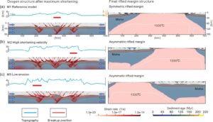 Figure 4. Alternative models illustrating how orogenic topography controls the final location of breakup. Importantly, the location of continental breakup always matches one of the highest mountain ranges (Li et al. 2024).