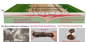 During tectonic convergence, the crust thickens and heats up within mountain belts. This internal heating is largely driven by the radioactive decay of crustal rocks—a process well recognized in geodynamics (England & Thompson, 1984). Because rock viscosity is highly sensitive to temperature in a nonlinear manner, even modest thermal increases can lead to significant reductions in lithospheric strength. Over time, these thickened domains gradually warm as radiogenic heat accumulates, producing thermally weakened zones within the lithosphere. This thermal weakening contributes to continental breakup within mountain belts.