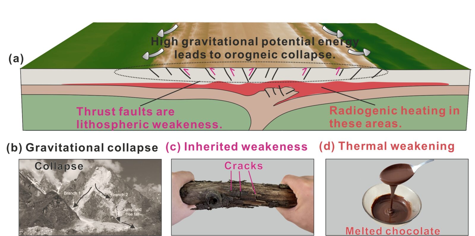 This intuitive image captures a fundamental geodynamic process. During tectonic convergence, the shortening of the lithosphere causes the orogenic crust to thicken and to develop pronounced topography, forming towering mountain belts. These dramatic landscapes are not only visually impressive; they also store immense gravitational potential energy (GPE). As the crust grows thicker and topography rises, the energy stored within the orogen increases significantly. These high GPE gradients act as internal drivers of deviatoric stress in the gravitationally unstable crustal root (Schott & Schmeling, 1998; Zoback & Mooney, 2003), which sets the stage for orogenic collapse and even crustal breakup.