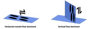 Figure 2: A simple sketch of how mantle flow is determined: mineral grains (black ellipses) deep in the mantle tend to line up in certain directions (their “crystal preferred orientation”), and this alignment lets us read the flow of the mantle like a fingerprint. This schematic shows a simplified case, based on the active slip systems of minerals considered in Roy et al. (2025), which best fits seismic observations. Flow patterns can look different if other slip systems are active; see the supplementary section of Roy et al. (2025) for details.