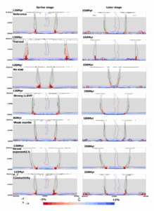 We have tested several properties like temporal evolution of plume surfacing events in the form of earlier versus later stages of plume formation, effect of thermal conductivity, stress exponent, strength of LLSVP, viscosities of ambient mantle, influence of the presence of a slab, morphological differences between thermochemical (presence of LLSVP) and thermal (no LLSVP) plumes and their effects on the anisotropic signature of mantle plumes (Figure 3).