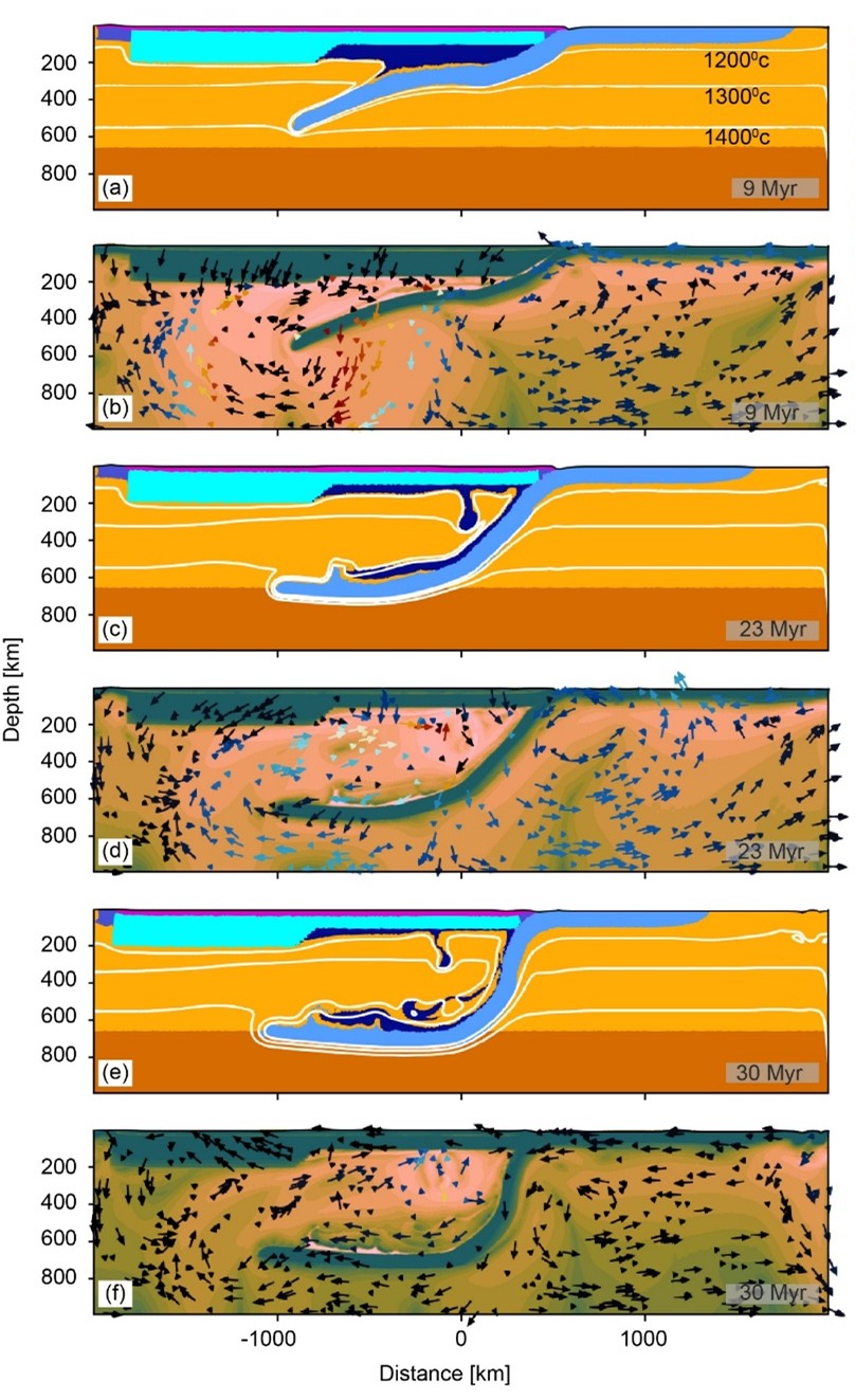 Fig. 2. Snapshots of the NCC destruction from reference model M2 (Paul et al., 2025) after 9 Myr (a,b), 23 Myr (c,d) and 30 Myr (e,f) respectively. Background colours in (a,c,e) represent geological units which are indexed in the top right. The dark blue region indicates the weak craton which is forming lithospheric drips. White lines indicate isotherms. Background colours in (b,d,f) represent viscosity and the arrows represent velocity (Figure taken from Paul et al., 2025).