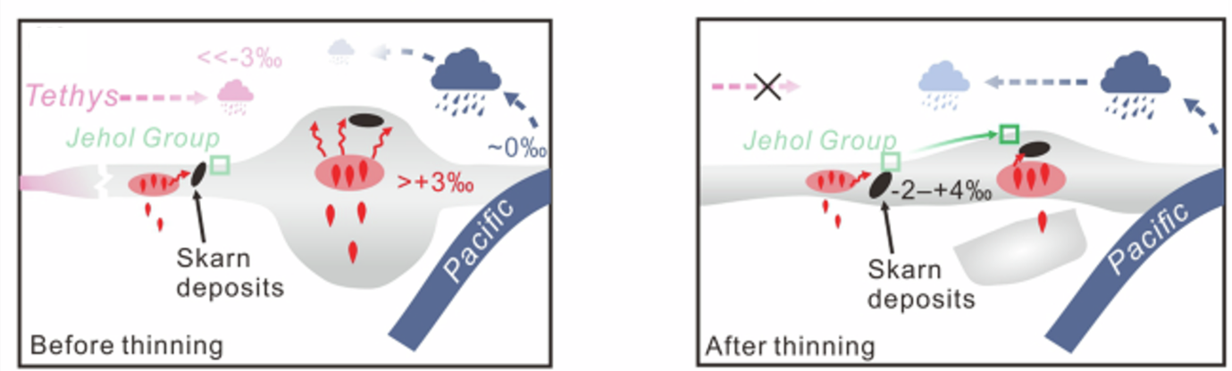 • Topography Flip: Prior to destruction, the NCC blocked Pacific moisture from the east. After the craton’s demise, topography reduced, and δ18O values from garnets show a sudden shift from meteoric to seawater signatures, which means the ocean breezes from the Pacific finally made it inland (Fig. 3).