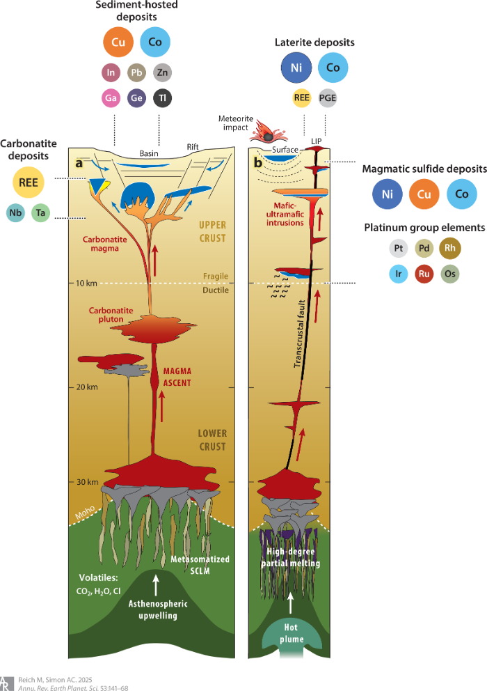 Fig 1: Schematic model for REE and Ni-Cu-PGE deposits. Figure (a) shows geodynamic conditions favouring REE deposits, which form in cratonic rifts. The model shows all geologic processes starting with formation of melts and fluids from the metasomatized mantle, right until their emplacement in the upper crust. Figure (b) shows geodynamic processes in magmatic sulphide deposits. It shows how high-degree melt generated from mantle plumes migrate to crust and form this type of mineral deposits (Figure taken from Reich and Simon, 2025).