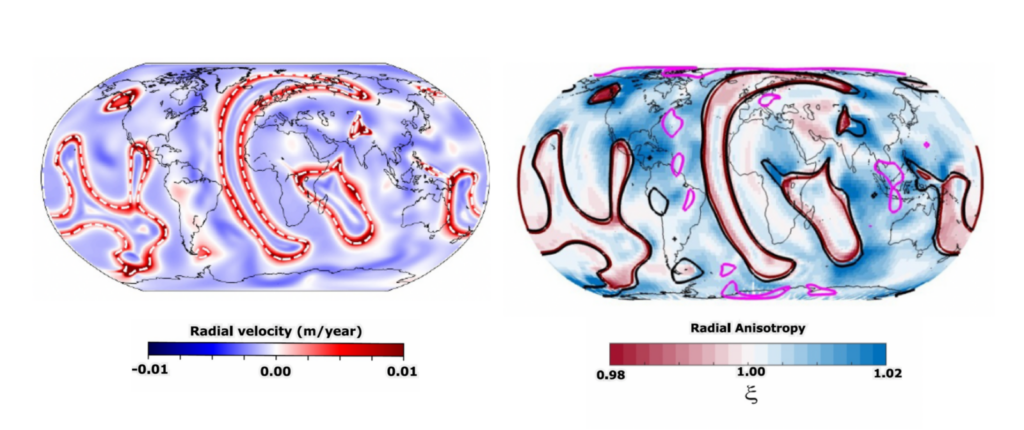 Figure 2: Left: Radial velocity at 2,800 km depth near the core–mantle boundary, with LLSVPs outlined by dashed white lines (compositional threshold ≥0.15). Right: Shear-wave radial anisotropy at 2,800 km depth. Dark red highlights LLSVPs (same threshold), while mantle plumes and subducting slabs are tracked by 350 K (black) and −100 K (magenta) nonadiabatic temperature isosurfaces (taken from Roy et al., 2025).