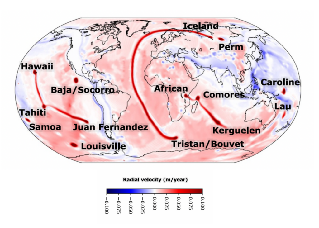 Figure 3: Radial velocity at 440 km depth, showing where mantle plumes rise. Plumes appear as concentrated, rounded upwellings at the tips of ridge-like structures, and we name them after the nearest surface hotspots (taken from Roy et al., 2025).
