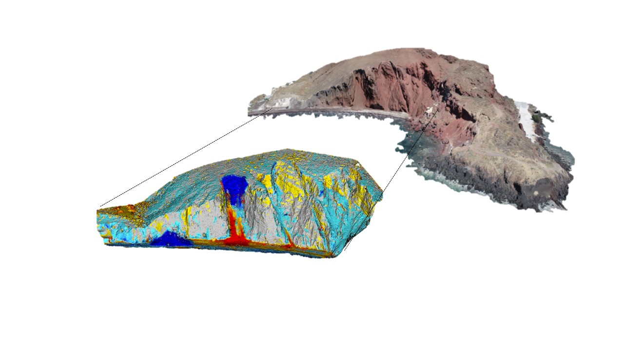 In Santorini, that conceptual approach became even more powerful when combined with high-resolution 3D data. Flying along the caldera cliffs wasn’t always easy, the winds had their own plans, but once we captured the data, we could reconstruct the slopes in remarkable detail. Features that would be easy to miss in the field, minor fractures, small detachments, and surface changes, stood out clearly in the point clouds. But the real shift came when we stopped thinking of these objects as static. We repeated our surveys and started comparing them. Instead of a single 3D model, we now have multiple snapshots of the same slope taken at different times. That’s where things moved from 3D into something closer to 4D.