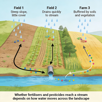 A key lesson for me has been that whether substances applied to fields reach a stream depends strongly on how water moves across the landscape. Topography, soil type, vegetation cover, artificial drainage and distance to the channel all influence how rainfall becomes runoff. Some fields drain quickly into nearby streams, while others are buffered by soils, slopes or riparian vegetation. Yet many assessments still rely on the proportion of agriculture in a catchment, a simple measure that ignores these hydrological pathways.