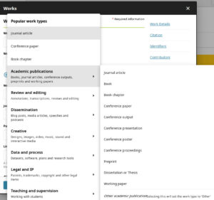 Most importantly, you need to manually add “works” other than journal papers and conference abstracts (imported automatically) to demonstrate the diversity of your work. This includes datasets, codes and preprints but also outreach or teaching activities (see figure below).