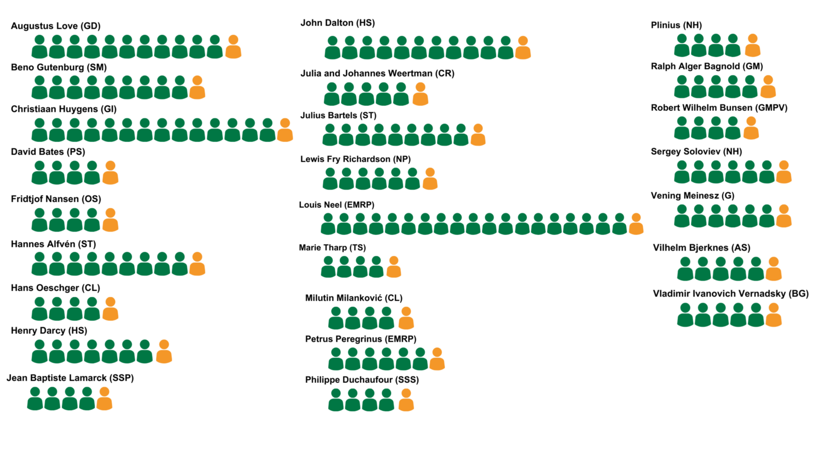 Figure 2: Winners of 25 awards across 22 EGU Divisions showing male recipients in green and female recipients in orange from 2004-2024.