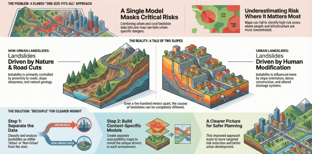 Cities are expanding faster than ever, often onto steep and unstable terrain. As urban areas grow, landslides increasingly threaten homes, roads, and critical infrastructure. To manage this risk, scientists produce landslide susceptibility maps, which estimate where landslides are most likely to occur. These maps are widely used by planners and decision-makers. But there is a quiet assumption built into many of these maps: that landslides occurring in cities and those happening in surrounding rural areas follow the same rules. Our research suggests that this assumption does not hold [1].