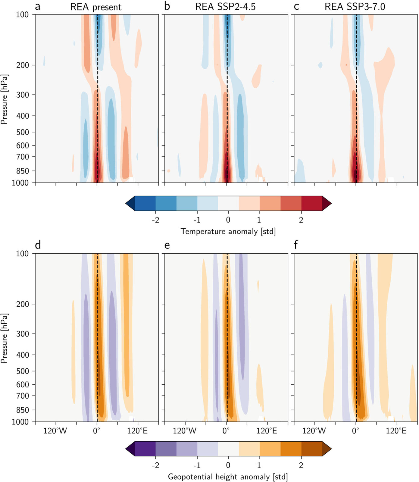 Noyelle et al. (2025), Fig. 2; Vertical cross-section of summer averaged standardized anomalies of (a–c) air temperature and (d–f) geopotential height for centennial hot summers. Standardized anomalies are computed by removing at each grid point the mean and dividing by the standard deviation computed on the control simulation of their period. The cross-section is computed after a latitudinal average between 40° and 70°N. The black dashed line shows the longitude of the grid point where the score function is computed.