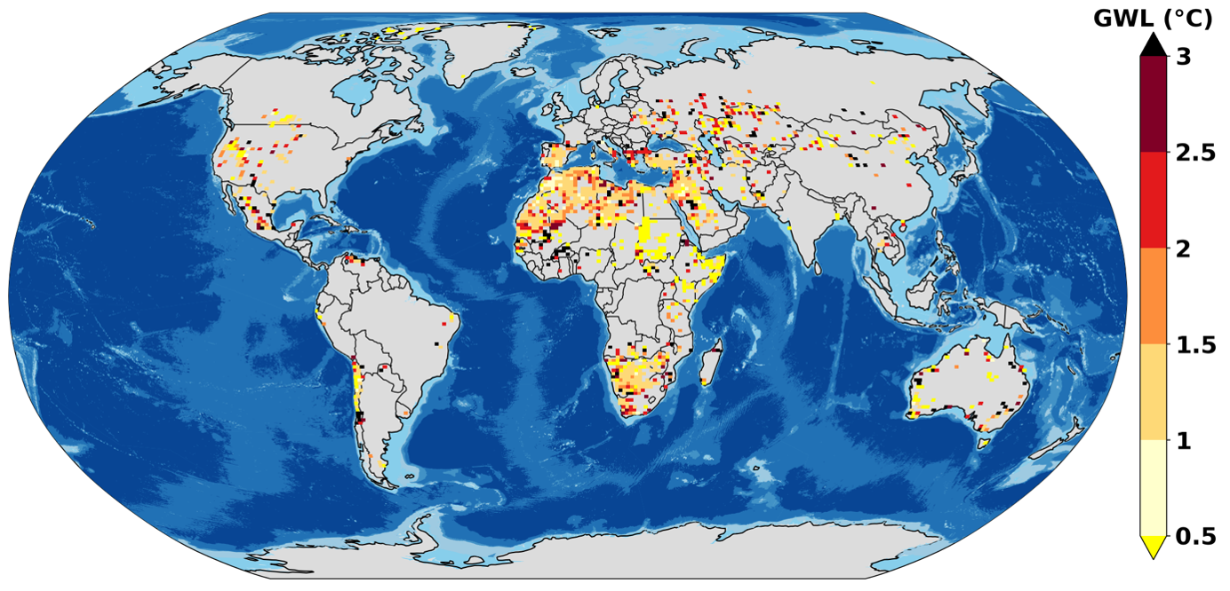Ravinandrasana and Franzke (2025) Fig. 4b: Global distribution of the Global Warming Level (GWL, in °C above preindustrial) corresponding to the ToFE of DZD, providing insight into the warming levels associated with the onset of DZD events.
