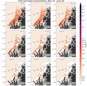 Figure 3: Average dissolved methane concentration over the modeling period resulting from the modeled gas seeps.