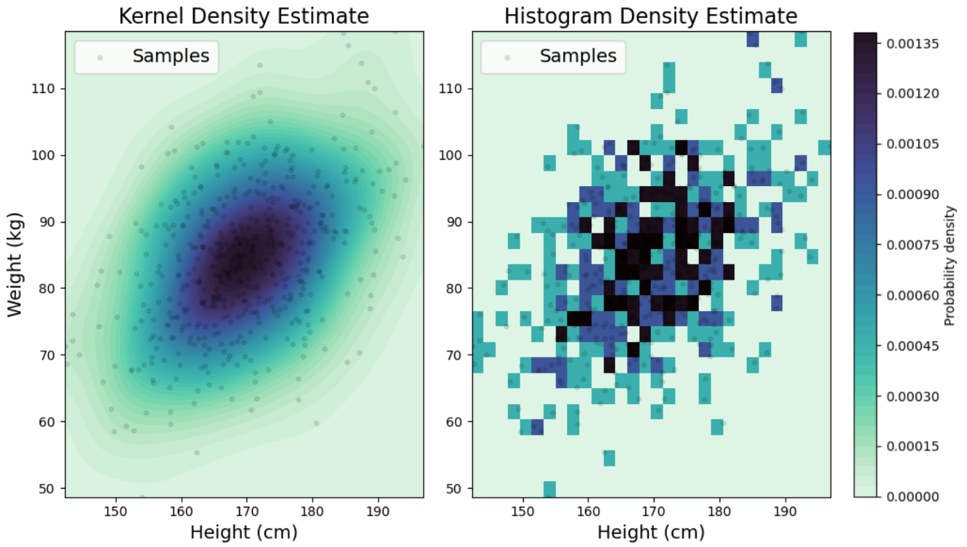 Figure 2: Density estimates of body weight and height for 500 university students from a hypothetical university using a kernel density estimator (left) and a histogram density estimator (right).