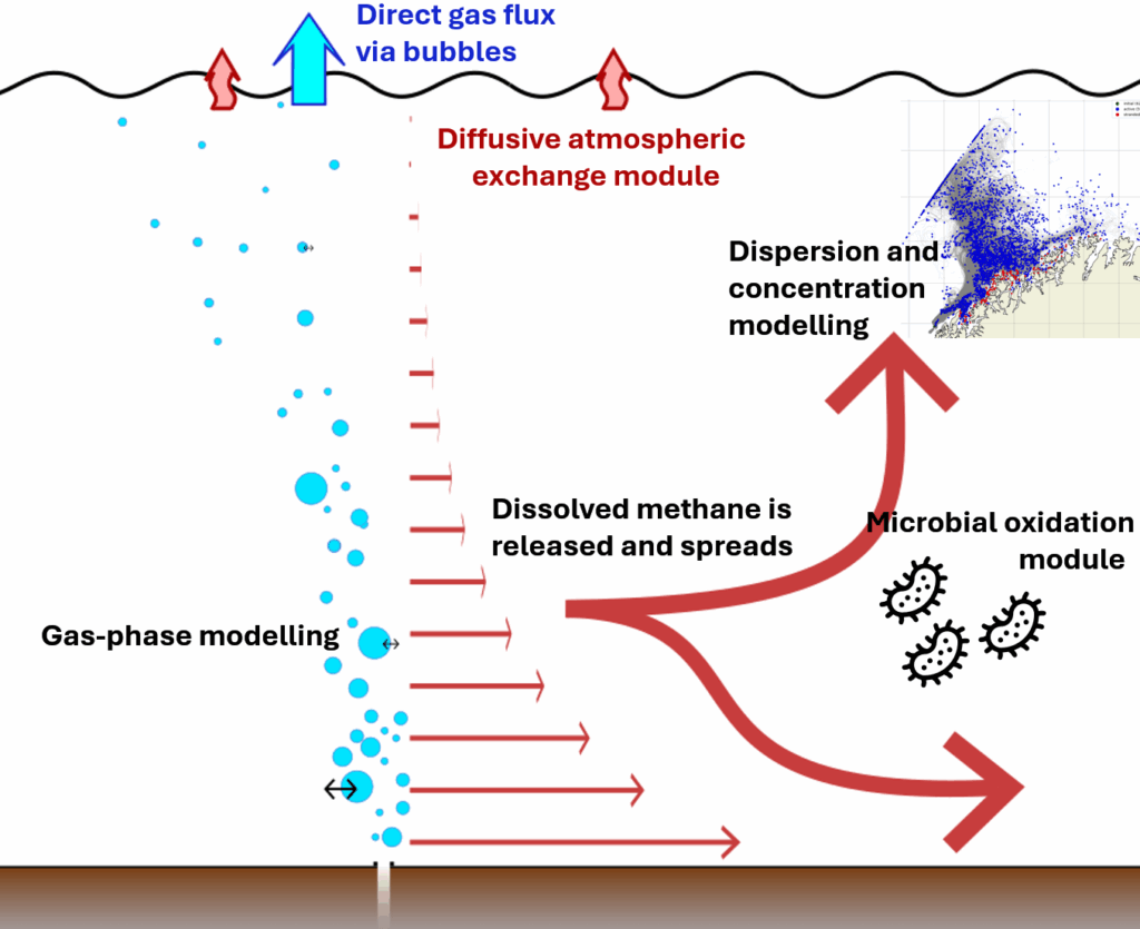 1. A bubble gas phase model which simulates the behaviour of gas in bubbles rising from the seafloor – how quickly and where gas dissolves into seawater and how much gas escapes directly to the surface
