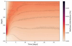 We tested this framework on a natural methane seep site located offshore northwestern Norway, at a depth of about 200 meters by simulating the fate of released methane for one-month starting May 20 and ending June 20, 2018 (Figure 3 or as animation).The results revealed a surprisingly dynamic picture: Most of the released methane (99.7%) dissolved in the water column, predominantly close to the seafloor. Then, within just a few days, the dissolved methane was rapidly transported upward and away from the seep site by upwelling currents and turbulence.  In essence, the vertical concentration profile flipped, with the concentration maxima moving from about 200 meters depth to around 10-20 meters, creating favourable conditions for methane to exchange with the atmosphere (Figure 4). Still, only a small fraction of the methane escaped – the most likely fate for a methane molecule was to be consumed by microbes(!). Over the course of our 1-month modelling period, we estimated that about two-thirds (65 %) of methane molecules was consumed by microbes, about one-third (34 %) remained in the water column and only 0.7 % was released to the atmosphere.