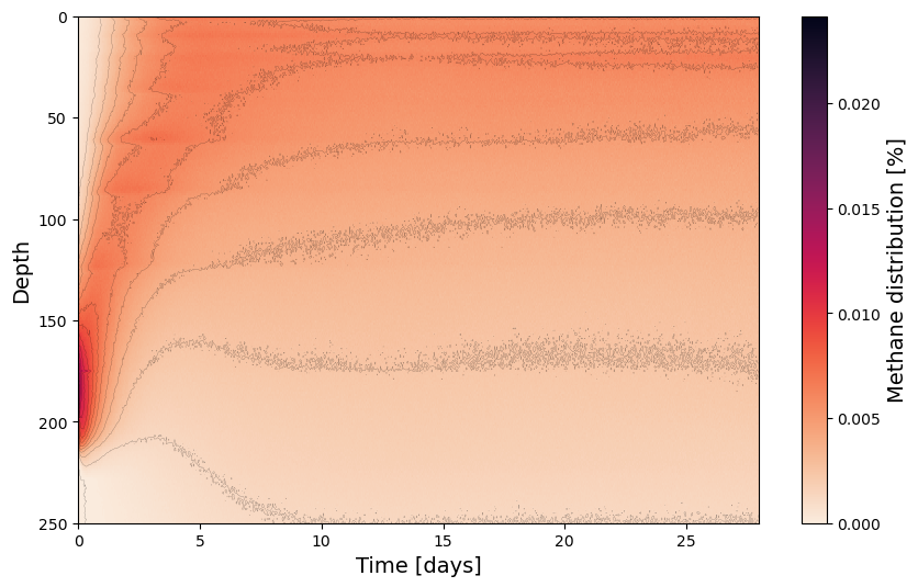 Figure 4: Vertical distribution of methane in the water column as a function of time after release.