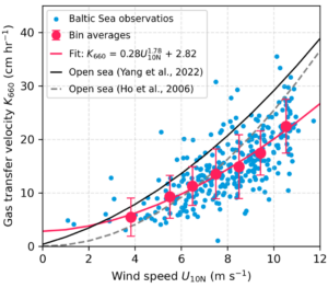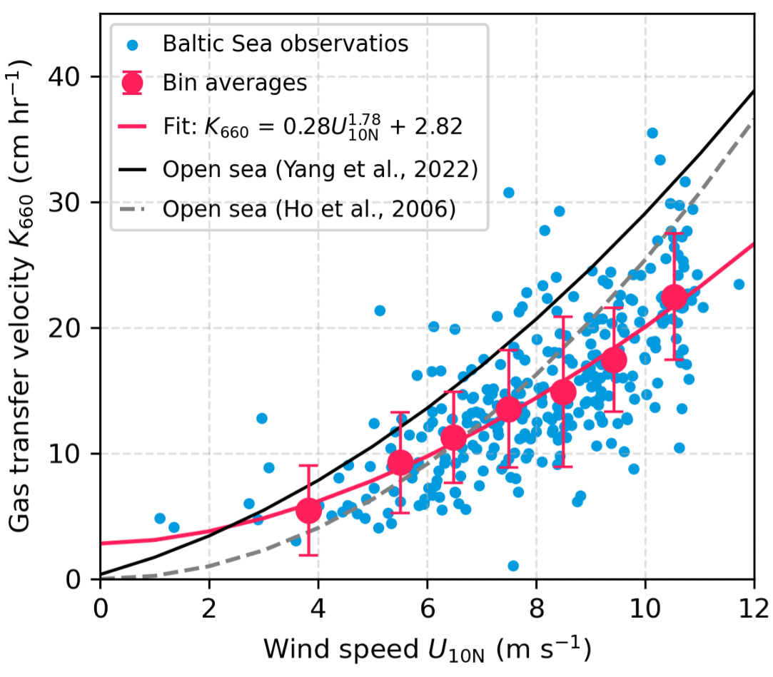 Fig. 2 The observed CO2 transfer velocities in the Baltic Sea (blue points) are significantly lower than the open ocean eddy covariance (black line) or dual-tracer (gray-dashed) data-based parameterisations. Blue points represent K660 derived from the 10-min eddy covariance air-sea CO2 flux observations during the CenBASE cruise, with red points denoting the 1 m s-1 wind speed bins. Red line is the power fit according to the red points. (Figure from Dong et al., 2026)