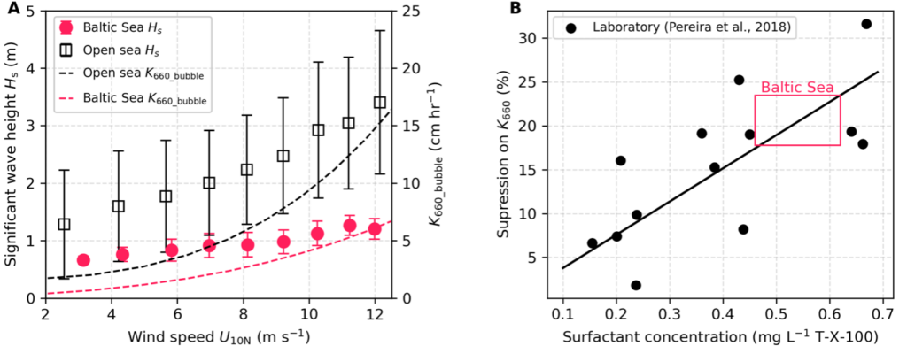 Fig. 3 A: Significant wave height is much lower in the Baltic Sea than in the open ocean under comparable wind speeds, which results in smaller bubble-mediated gas transfer velocity (K660_bubble) according to a sea state-dependent model (Yang et al., 2024). B: Abundant surfactants in the Baltic Sea is expected to suppress the K660 by ~20% according to a laboratory study (Pereira et al., 2018). (Figure from Dong et al., 2026)