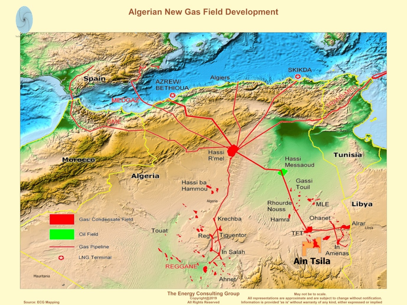 Figure 1 Main producing fields and export transportation pipelines of Algeria.