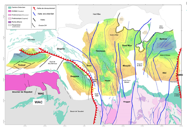 These basins rest on a large Precambrian basement shaped by cycles of extension and compression. The main hydrocarbon provinces, Timimoun, Ahnet, Sbaa, Mouydir, Béchar-Abadla, Oued Mya, Illizi and Berkine, also contain thick Triassic and Liassic evaporites acting as regionally continuous seals, allowing large structural closures to form.