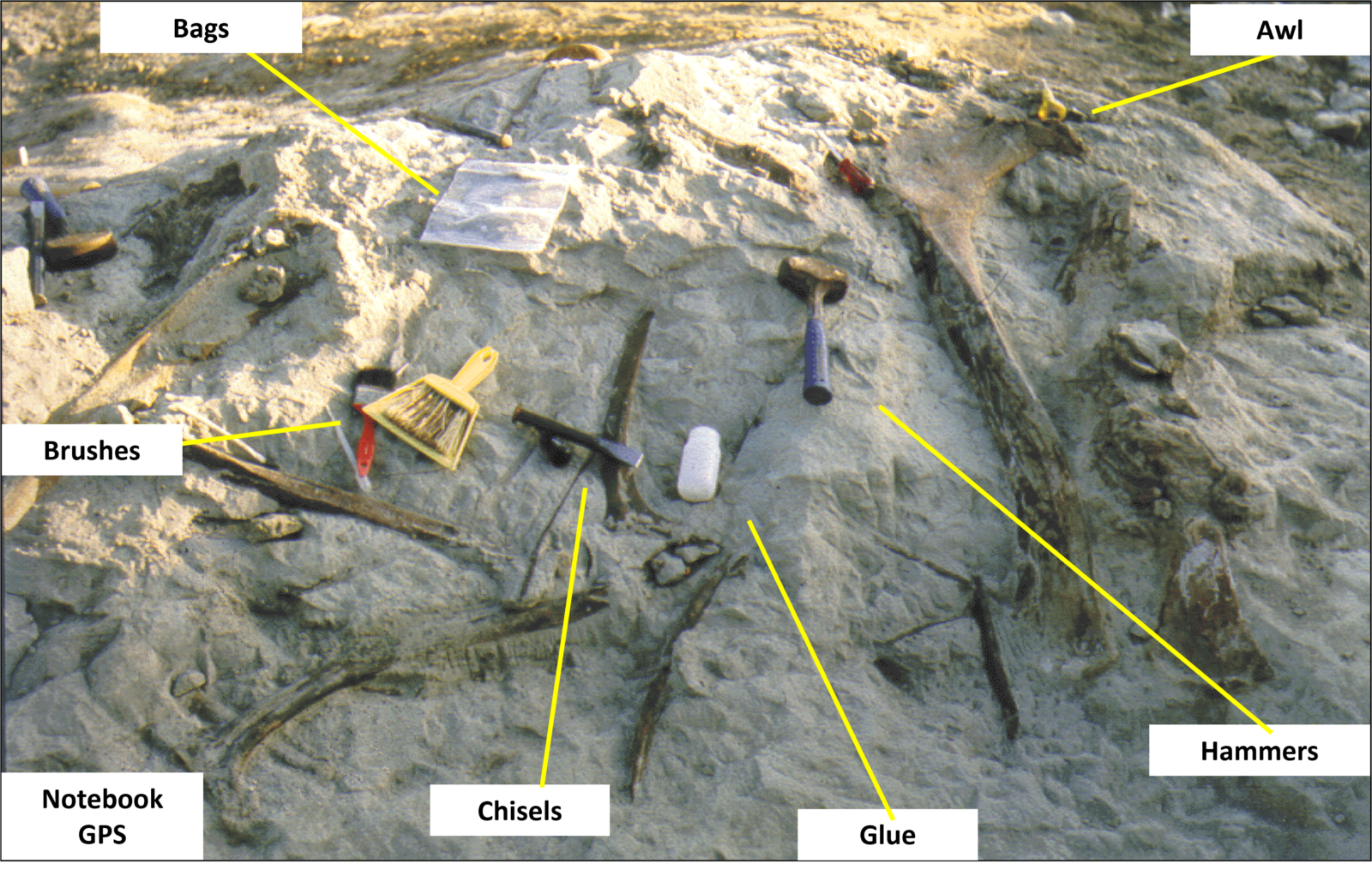 This kit may be supplemented by additional tools, depending on the complexities of the crime scene; a standard tool kit includes crime scene tape, camera and video equipment, a sketchpad and pens, a magnifying glass and tweezers, evidence bags, fingerprint casting kits, and glue. All these items would also feature in the geologist’s field bag, along with hammers, chisels, and awls (Figure 4). Additional items used at crime scenes usually include protective clothing, a flashlight, UV light, laser, infrared (geologists generally don’t need to work in the dark but use lasers to scan rocks in 3D), a serology kit, and an entomology kit.