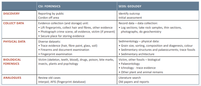 Both forensics and sedimentary geology have well-established workflows to identify cases and collect and interpret data relating to crimes or geological puzzles (Table 1). Data collection is key and should not be influenced by theories regarding what happened. The use of analogue data is often critical to making correct interpretations.