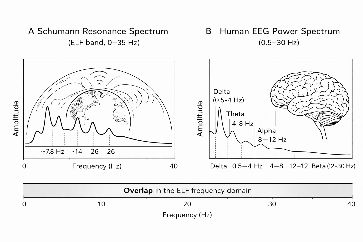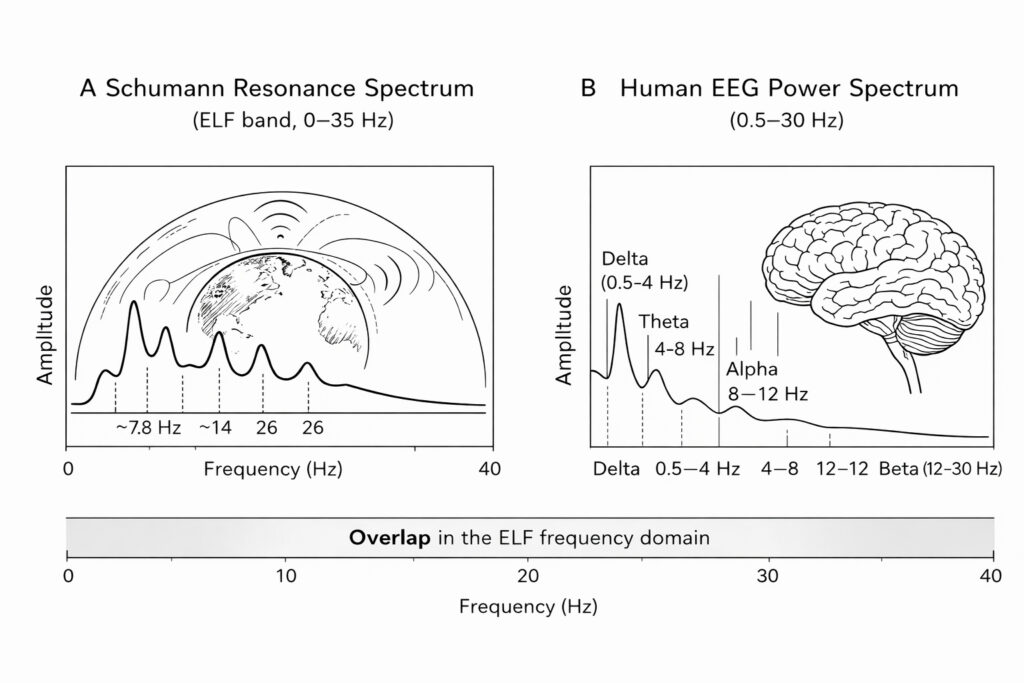 Figure. 1 Spectral comparison between the first SR band (ELF, 0–35 Hz) and the human electroencephalographic (EEG) frequency range (0.5–30 Hz). Panel A shows the Schumann resonance spectrum within the Earth–ionosphere cavity, including the fundamental mode (~7.8 Hz) and harmonics. Panel B shows the EEG power spectrum (delta, theta, alpha, and beta bands) with schematic scalp electrodes. The shaded interval indicates the shared Extremely Low Frequency domain (generated by Julius AI).