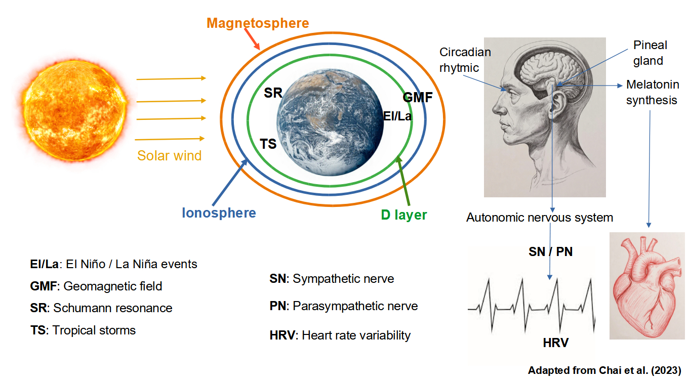 Figure2: Diagram of the effects of solar wind and its interaction with geophysical factors on the human body (Adapted from Chai et al. 2023)