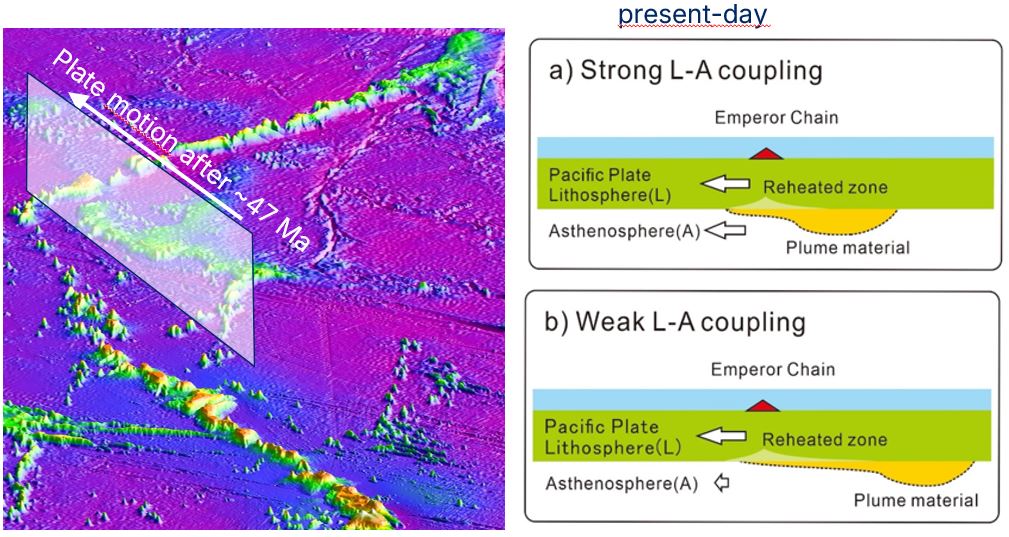 Figure 2: After a plate motion change around 47 Ma, the hot anomaly is sheared off from beneath the Emperor Chain while being replenished by continued northward mantle flow. Its expected position depends on how well it is coupled to the overlying plate. Credits: left: Bernhard Steinberger, produced with Generic Mapping Tools and Smith and Sandwell global topography dataset, right: Kiyoshi Baba
