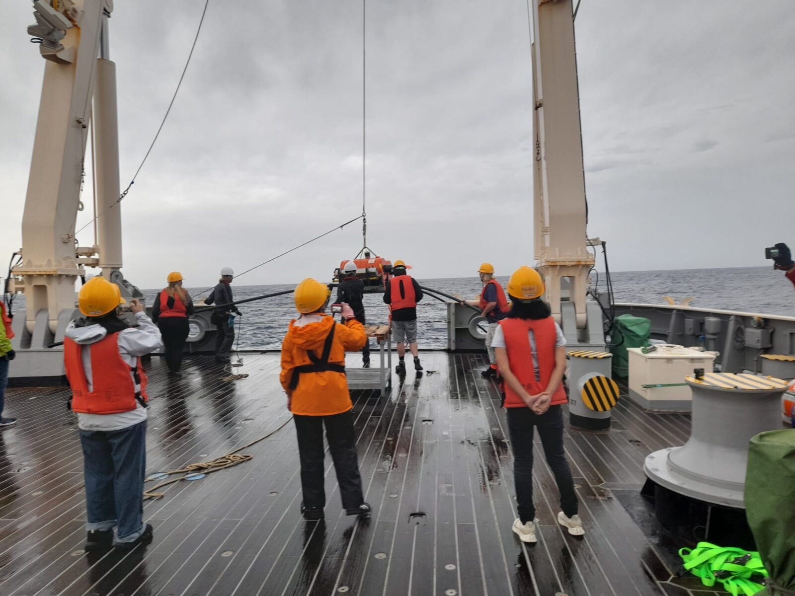 Figure 3: Deployment of an electromagnetometers (OBEM) from the institute GEOMAR. Photo by Bernhard Steinberger.