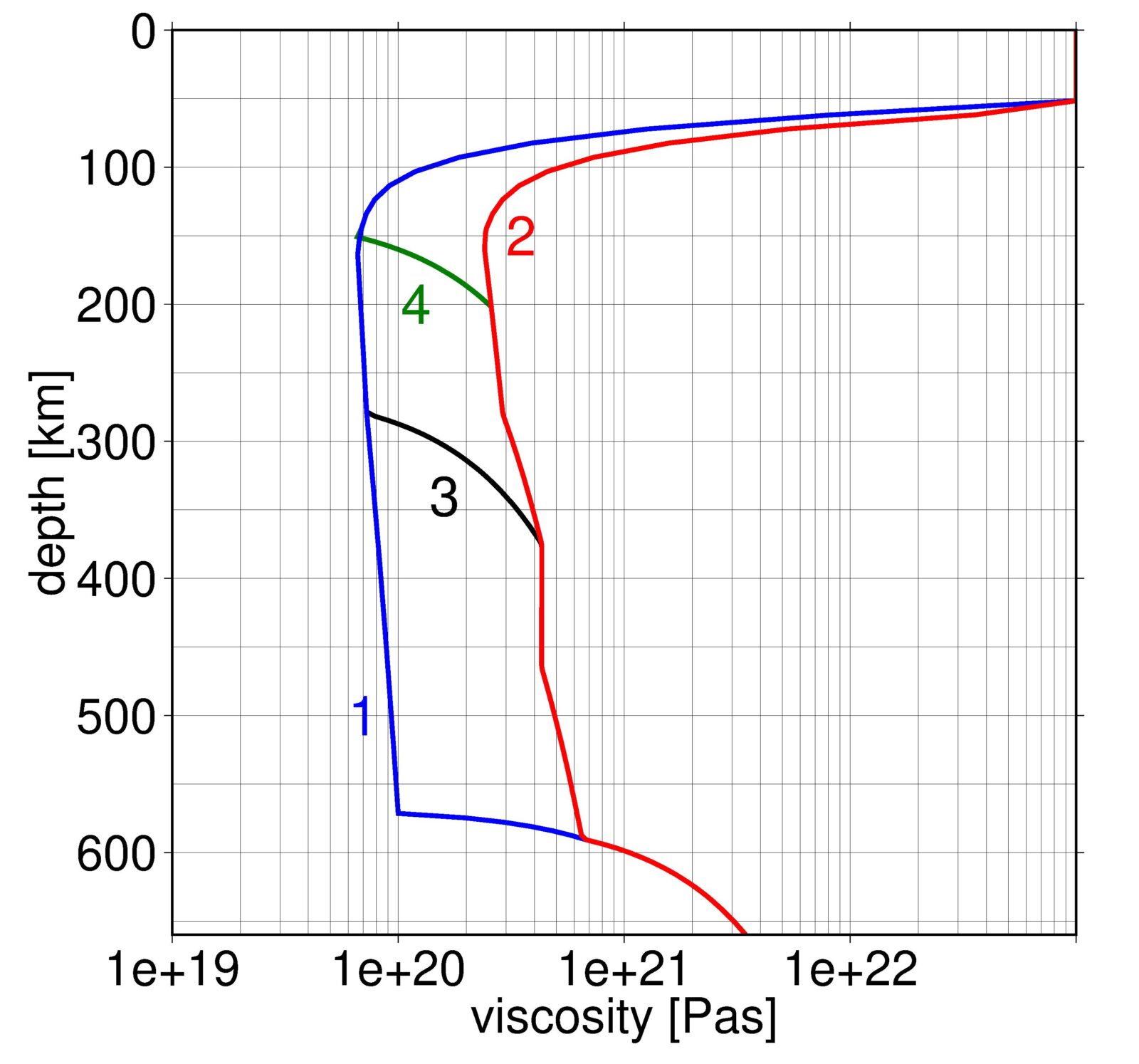 Figure 4: Four upper mantle viscosity models used in numerical models. igure produced by Bernhard Steinberger with Generic Mapping Tools