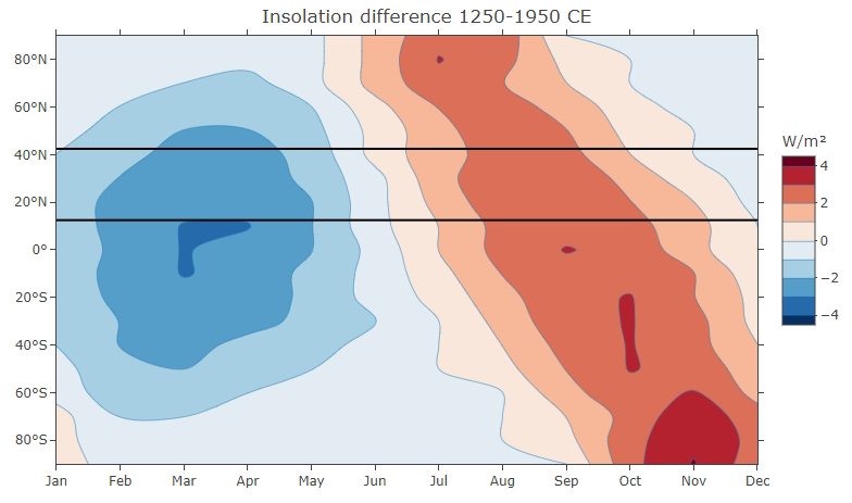 Figure: Insolation difference due to orbital forcing between the century of the Samalas eruption and present days (1250–1950 CE; own representation of data from Berger and Loutre, 1991 linearly interpolated). The study domain is between 12.5 and 42.5° N marked with horizontal lines.