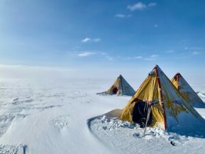 Picture 3: Popular yellow-red Scott polar tents anchored to the sea ice via V-threads. (Photo: Julia Martin)
