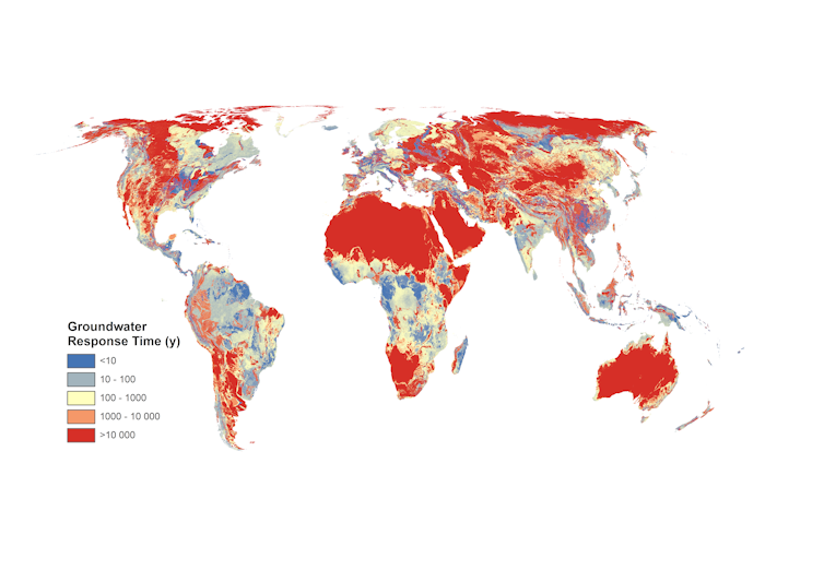 Estimates of response times for individual aquifers – the valuable stores of groundwater which humans exploit with pumps – have been made previously, but the global picture of how quickly or directly Earth’s groundwater will respond to climate change in the coming years and decades has been uncertain. To investigate this, we mapped the connection between groundwater and the land surface and how groundwater response time varies across the world.